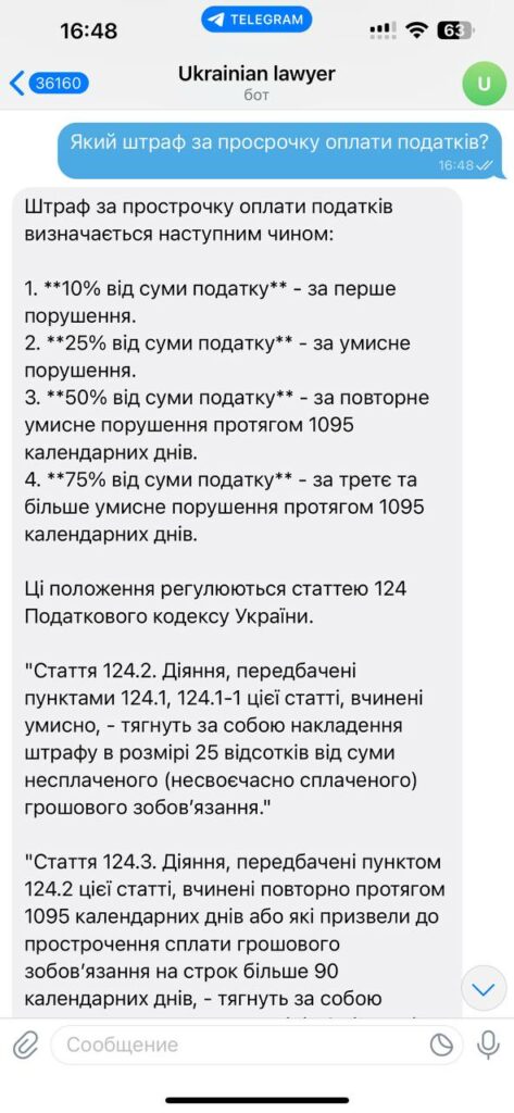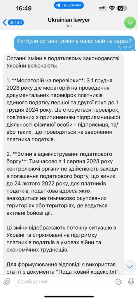 • Надає миттєві відповіді на запити користувачів відповідно до актуального законодавства.