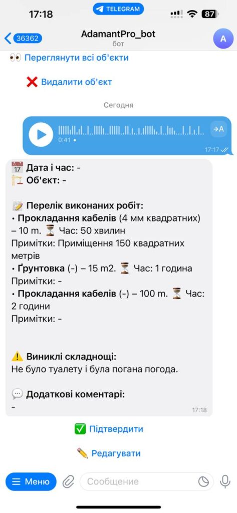 Автоматично визначає об’єкт – бот інтегрується у групу об’єкту, зчитує його назву та додає в систему для зручного вибору під час звітування.